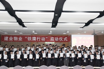 3月27日,特邀狼牙特訓(xùn)營對學(xué)員進行團隊凝聚力、組織協(xié)調(diào)力、執(zhí)行力、感恩引導(dǎo)等軍事化培訓(xùn)。3月28日、29日兩天,建業(yè)物業(yè)副總經(jīng)理張禮輝、基礎(chǔ)服務(wù)部總經(jīng)理王志初等領(lǐng)導(dǎo)分別對學(xué)員進行了禮兵崗位職責(zé)、標(biāo)準(zhǔn)化制度、消防聯(lián)動等課程的相關(guān)培訓(xùn)。29日下午,舉行“鐵鷹行動”啟動儀式:揭幕徽標(biāo)、宣讀誓詞、簽訂軍令狀。培訓(xùn)最后組織學(xué)員進行筆試考試,并舉行閉營儀式。