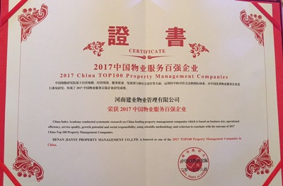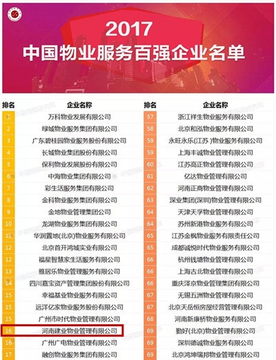 建業(yè)物業(yè)2017蟬聯(lián)中國物業(yè)服務(wù)百強(qiáng)企業(yè)榜單16強(qiáng)