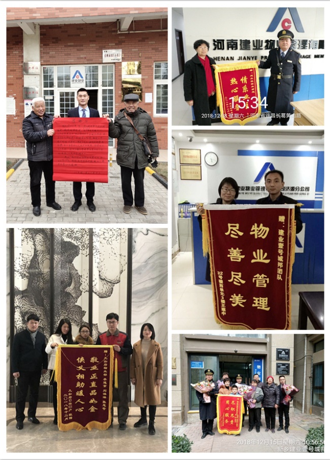 寒風(fēng)刺骨、呵氣如霜的12月,建業(yè)物業(yè)人一如既往地堅守在各個崗位上,從點滴之處關(guān)心幫助業(yè)主,為業(yè)主帶來暖心服務(wù)。2018年12月,全省各地共涌現(xiàn)出拾金不昧、技術(shù)高超、服務(wù)熱情、助人為樂等好人好事共222例,其中,收到錦旗78面、感謝信114封、致電感謝32起。