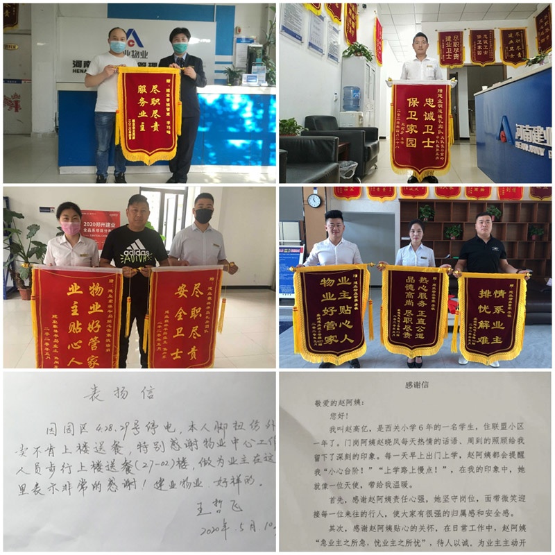 5月,建業(yè)物業(yè)各分支機(jī)構(gòu)共發(fā)生好人好事627件,其中錦旗148面,感謝信181封,致電表?yè)P(yáng)等形式308次。