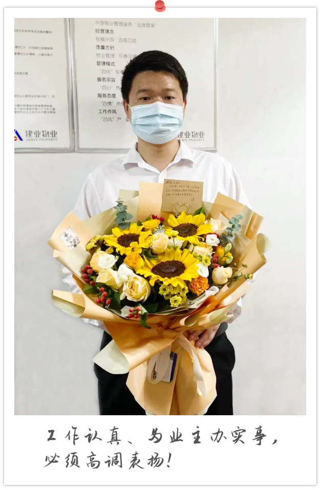 沒有講過的故事還有很多,沒有提到的物業(yè)人也有很多。7月19日上午10點,一束鮮花送到了駐馬店·建業(yè)森林半島貼心管家趙海龍手里,在隨贈的卡片上,業(yè)主寫道:“工作認(rèn)真、為業(yè)主辦實事,必須高調(diào)表揚!”