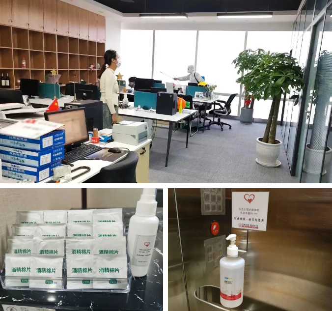 在明確復工時間后,建業(yè)物業(yè)迅速組織工作人員,對公共區(qū)域進行全面消殺,并對電梯、客戶公司門把手、垃圾桶等區(qū)域進行重點消毒。設(shè)置體溫監(jiān)測儀、更新場所碼,為即將到來的復工做好充分準備。